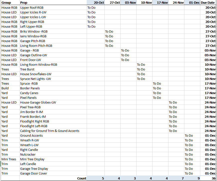 When the order arrives is usually the trigger for me to start thinking about the build. The first piece is to come up with is a new Light-O-Rama Preview (layout) which I had roughed out in Aug before making my order but I now needed to finalize so I can begin converting my sequences to include the new props.