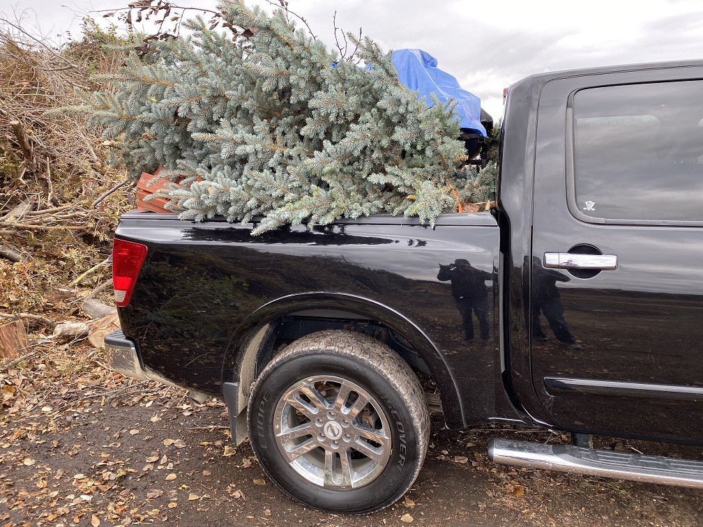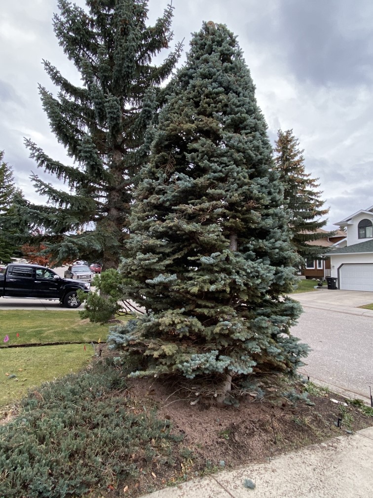 This year I finally got permission to top the spruce tree in my front yard, which had a second Christmas tree growing out of the top. I had only been able to prune it as high as I could reach with my ladder and it was starting to look very silly as the top tree got bigger and bigger (I didn’t realize how big , over 10′, until I felled it and had to cut it in 1/2 to get in the truck). After topping and shaping it, it looks much better and ready from a few thousand lights.