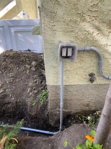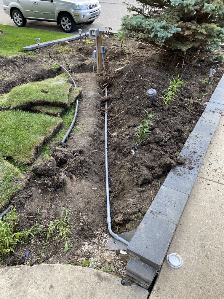 It seemed a little foolish to be digging up my lawn again after digging up my sprinkler system to fix all the lines and heads (not that I’ve needed it with the weather this summer) and then digging out the front flower bed and building a retaining wall around it. But all the digging got me to thinking about running power lines.