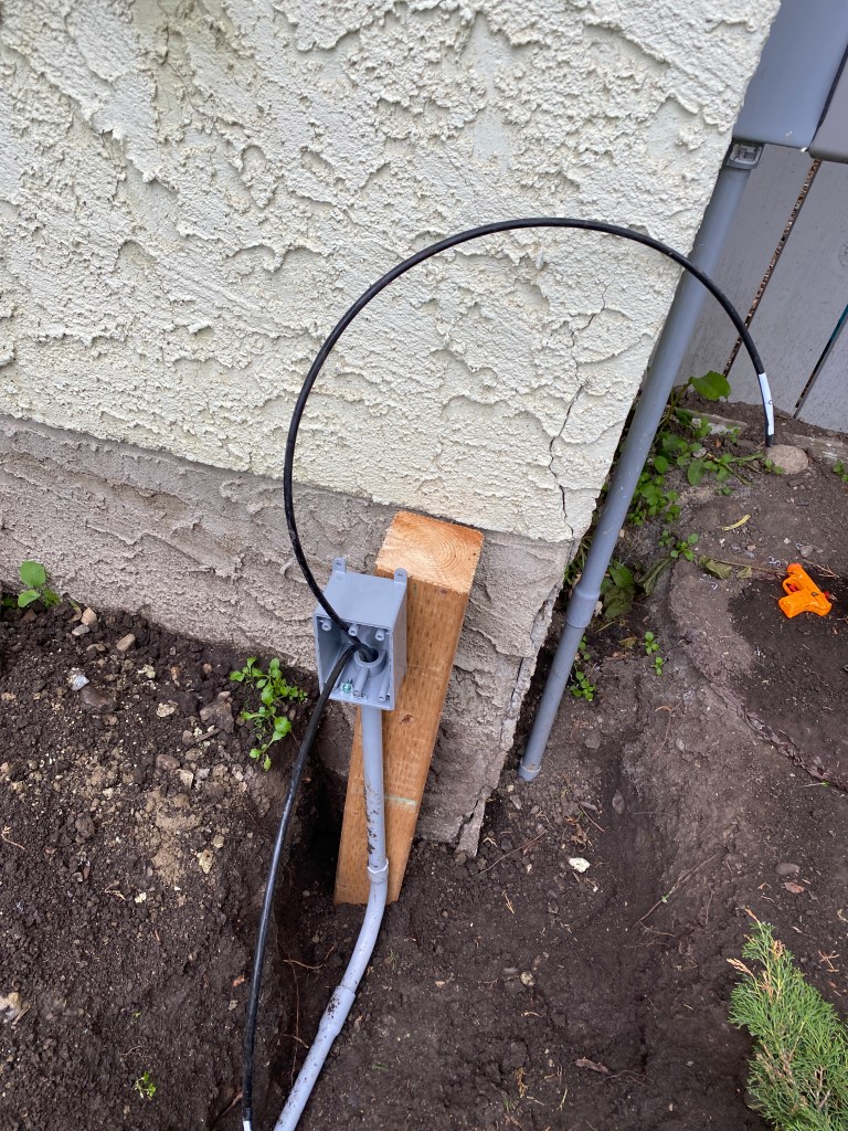 After the power was done, I thought it would be a good idea to put in some permanent network cables. I filled in the trench about 30 cms then laid some conduit and put in three outdoor cat6 lines from the computer in my garage to the front flowerbed then 2 lines from the flowerbed; one to the front of the house and one to the tree then from the tree to the front of the house.
