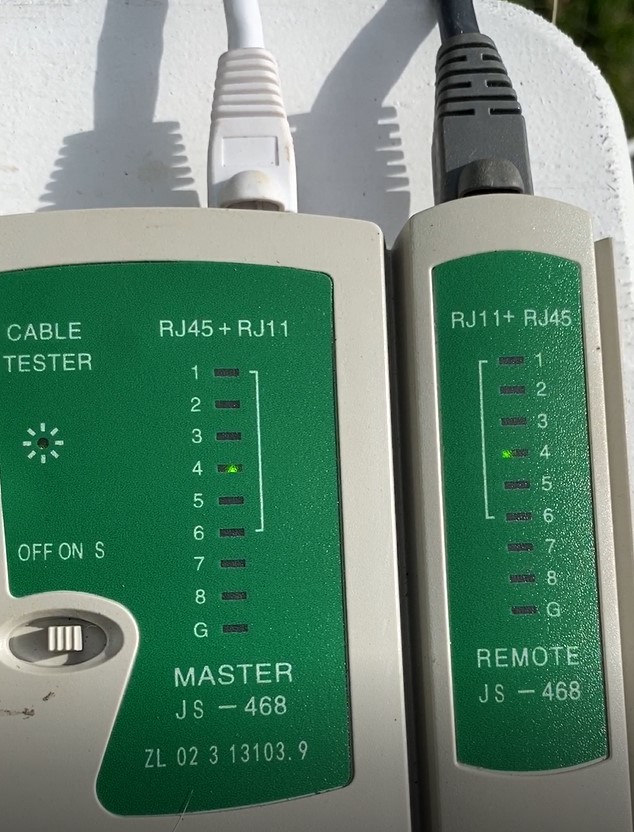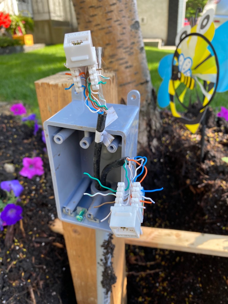 Before filling in the trench I needed to test the network cables. All seemed to work so I glued up the conduit, fitted the waterproof boxes. I tested the cables again and I had one line not working, removing the end it seemed I had nicked one of the wires and it broke when I put it in the box. I tried again and did the same thing, a third attempt to finally get it all working. Being the paranoid individual I am, using the cable tester wasn’t enough, I also had to hook up a PC and a controller to make sure I got LOR signal on each line. I cemented the posts in place, filled in the trench then tested again.