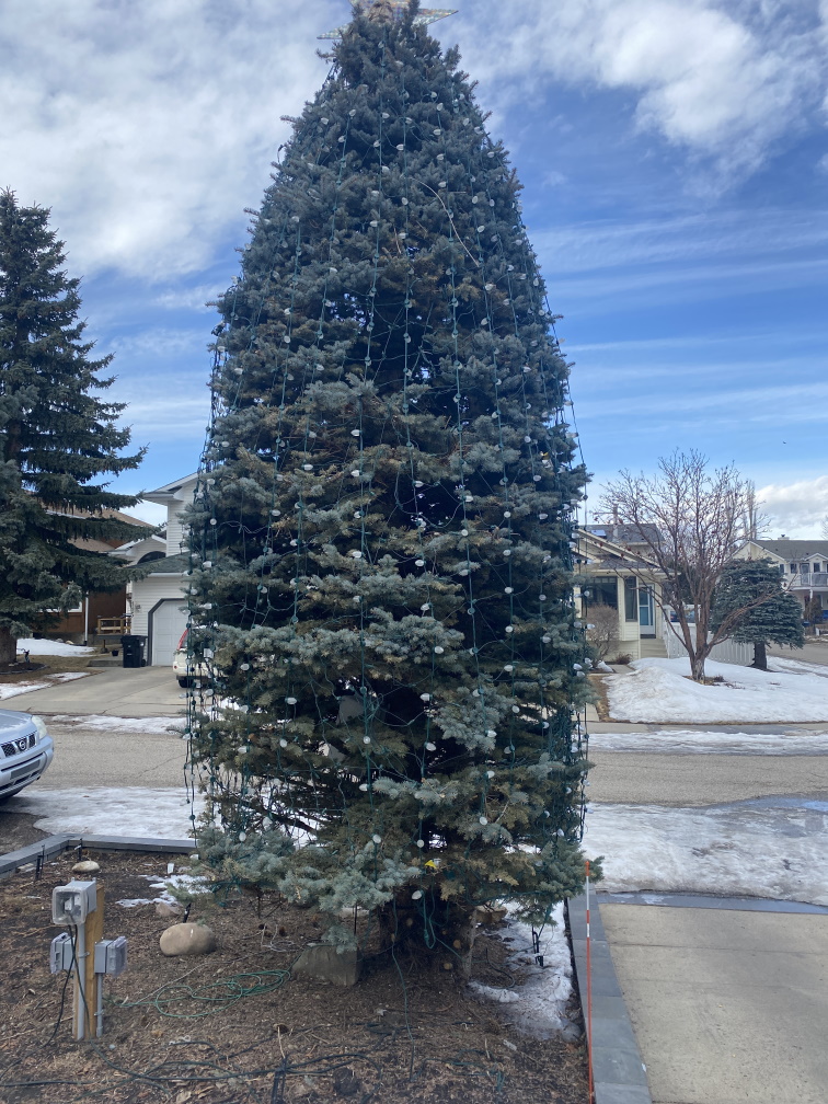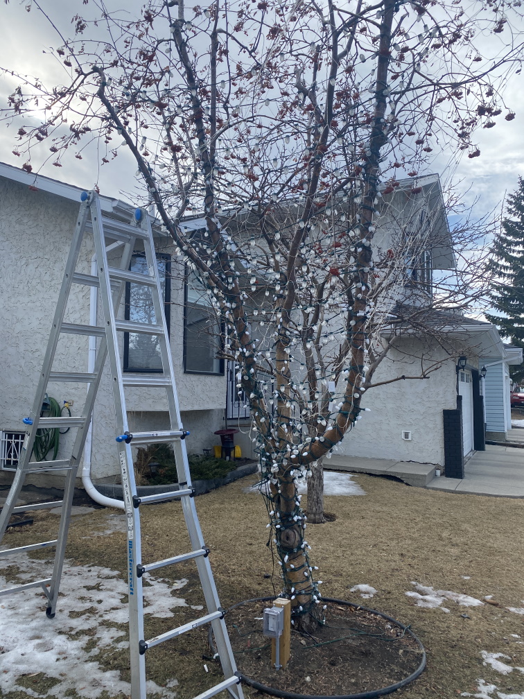 As we got into march the sun began to shine and the temperatures were above freezing which motivated me to get out and finish up the clean up, the first weekend in March I took down the lights from the tree’s. First was the Ash tree then the spruce tree.