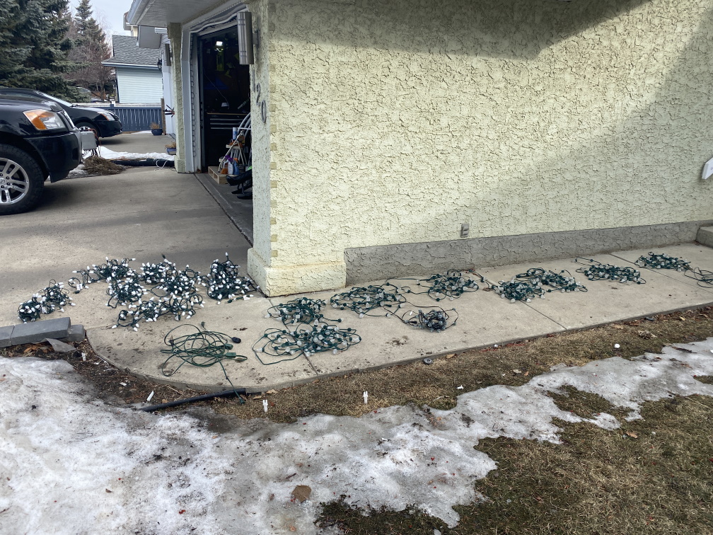 Now it was just a matter of checking items each day and grabbing a cable or pathway light as the ice released them. Once the final lights were out the ground they could be packed away for the summer. Once all the lights were out it was time to reorganize the garage which requires removing all the lights, taking the car our and then packing away the light for summer. This is usually a day long job but its a good one because I have a car to drive at the end of it and access to bikes and other spring time things.