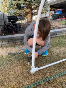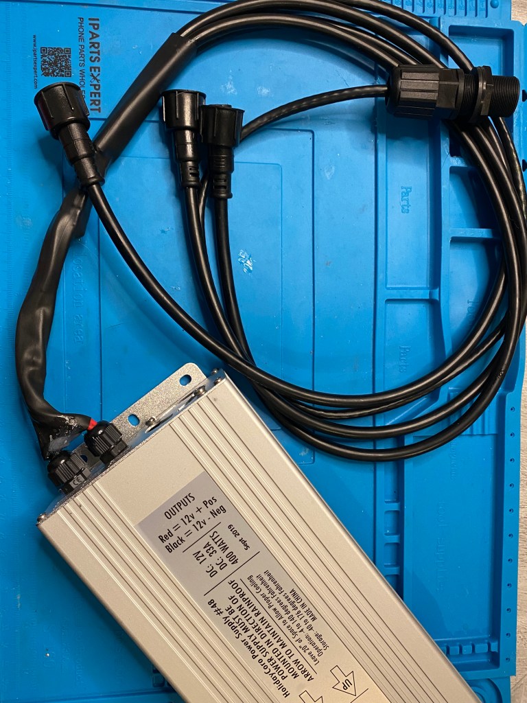 Even after a productive weekend I was still a little behind, I wanted to do some work through the week to catch up. I usually don’t like working in the dark as I tend to break more things than make progress, then I realized I had a reliable light source,. I turned all the lights on in white and had near daylight to work in. This allowed me to get all the Dumb DMX RGBs (North Poles & Bucket lights) connected. Other night time projects for the week included getting the second power supply built for the dumb RGBs. We also had a little accident, where I mistakenly assumed the driveway ended at the cement, but not everyone feels that way.