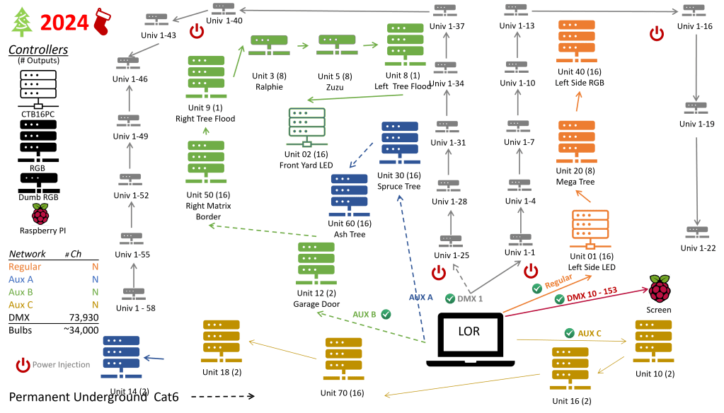 During my time on vacation I managed to knock off most of the sequencing. I decided not to change the layout too much, reverting to having the panels along the front of the house, vs. in a vertical stack like they were last year. The panels will be laid out the way they were from 2019-2021. The Santa house will be moving back to its original location beside the garage vs. being at the front of the house last year. Small changes to the layout means minimal changes to the sequencing so I could bang them off pretty quickly. I did want to change my network config as I thinks some of the issues last season were because the networks were too dense (as I removed one to use my underground cables for the Santa house, moving it back means I can spread out the controllers over an extra network).