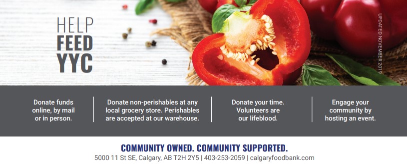 For the 5th year we will once again be collecting food and online donations for the Calgary Food Bank. Our goal this season is to collect a total of $2,000 in online donations and lbs of food.